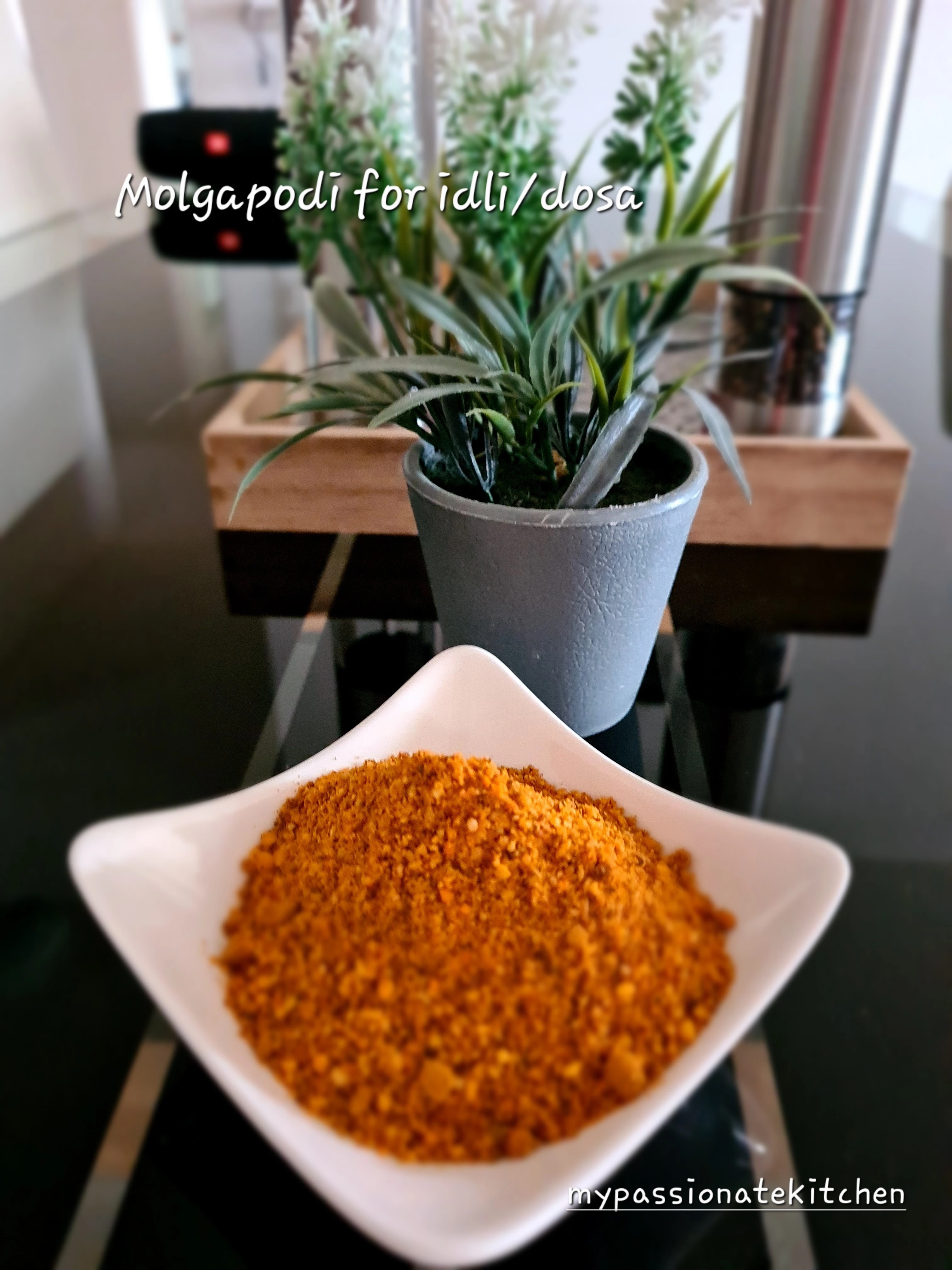 Molagapodi, also known as idli podi or gunpowder, is a popular South Indian spice blend made from roasted lentils, chili peppers, sesame seeds, and various spices. The ingredients are dry roasted separately until they turn golden brown, then ground together to form a coarse powder. The resulting powder is a flavorful and aromatic blend that is typically served as a condiment with dosa, idli, or other South Indian dishes.